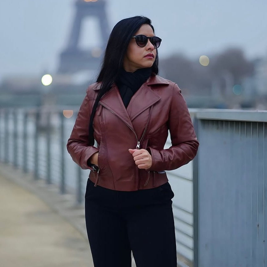 This cropped dark brown leather jacket for women showcases a quilted design throughout, enhancing its textured and structured appearance. Made from real leather, it features a button-front closure, a classic shirt collar, and a tailored fit that exudes confident style. Its cropped length and precise seam detailing make it an ideal match for high-waisted jeans or layered ensembles.