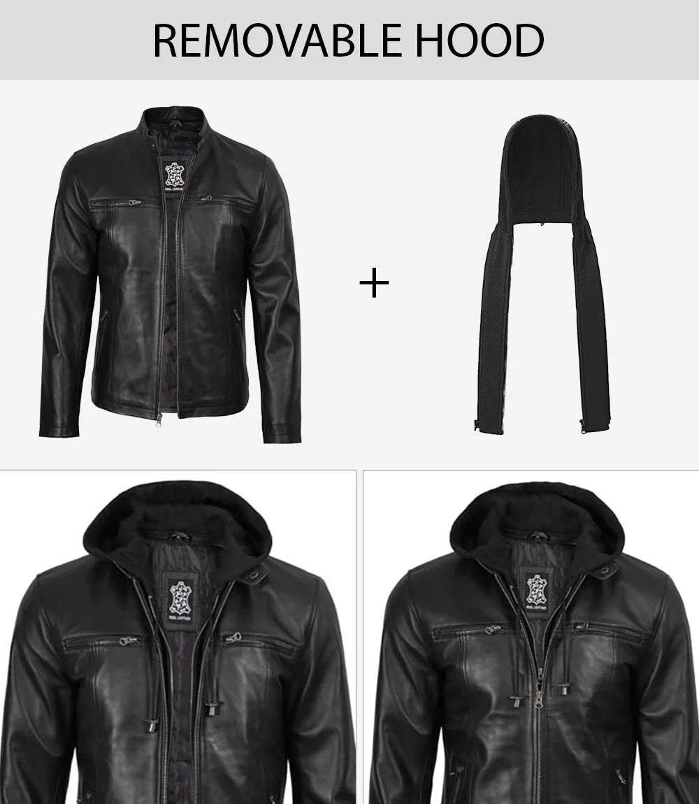 Jonathan Veste en cuir noir Cafe Racer pour homme avec capuche amovible