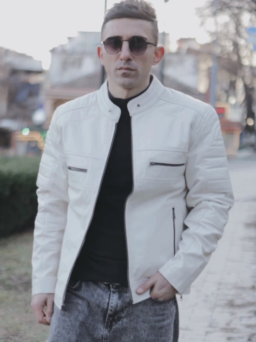 Attirez tous les regards avec cette veste en cuir café racer blanc cassé, confectionnée en cuir véritable pour une finition raffinée et lisse. Dotée d'un col montant, de coutures soignées et de multiples poches pour une fonctionnalité optimale, cette veste allie style classique et modernité. Idéale pour ceux qui recherchent un look original et une polyvalence au quotidien.